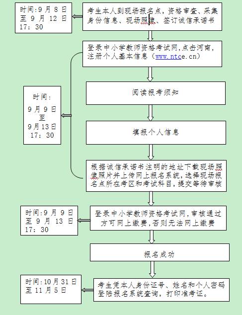 9月9日至13日,现场报名完成的次日后,考生按照“诚信考试承诺书”上提示的网址、密码和本人身份证号,下载报名现场采集的照片,然后登录全国中小学教师资格考试网(www.ntce.cn),选择“河南”进行网上报名。考生登录后经过注册,按相关提示填写个人信息、上传本人在现场报名时采集的照片(未现场采集信息或上传照片为非现场采集者,审核将不予通过)、选择考试科目和考区(须与考生现场报名点所在考区一致),提交等待审核。