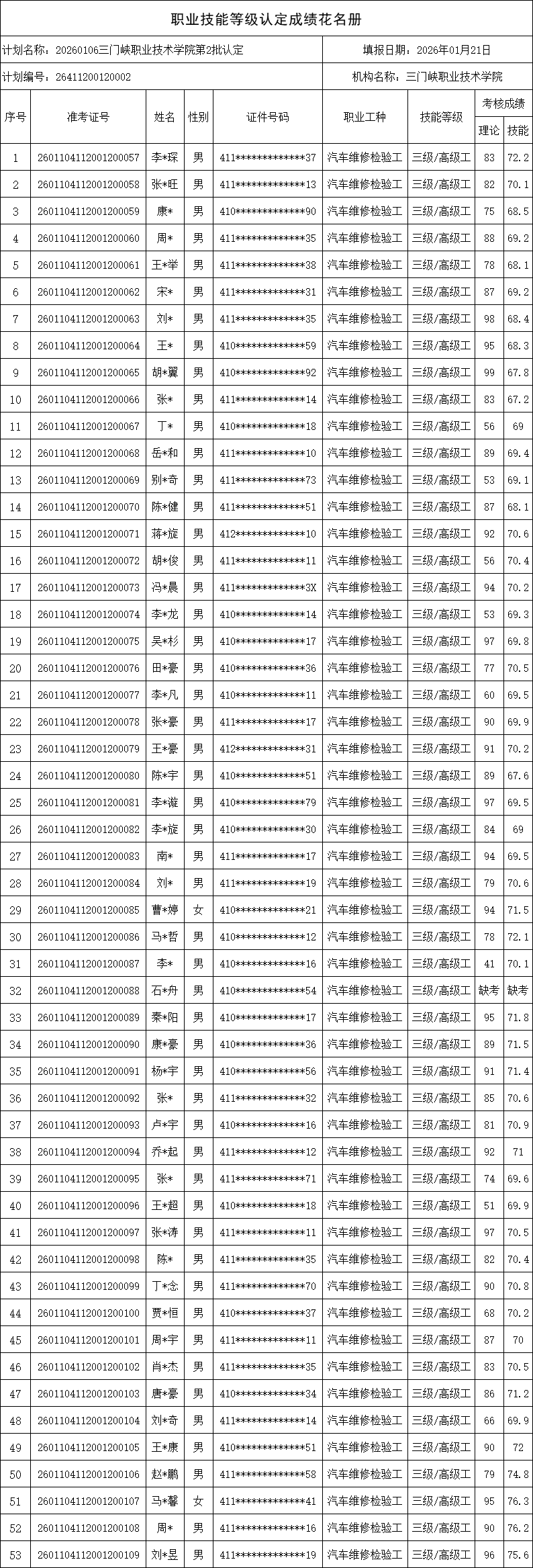 2026年1月10日,我院组织了汽车维修工(汽车维修检验工)(三级)职业技能等级认定考核(计划号:26411200120002),应考人员53人、实际到考52人,认定对象为社会考生,现将成绩予以公示。